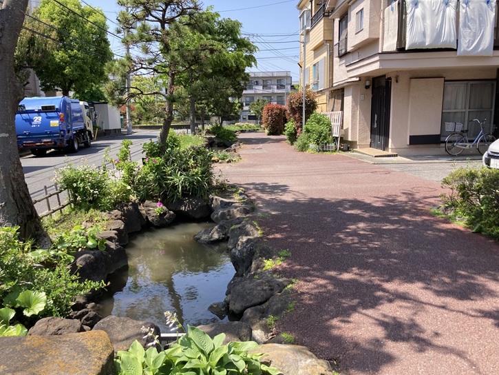 舗装された遊歩道は幅広で歩きやすく、街路樹からの木漏れ日を浴びながらくつろいだ時間を過ごすことができます。遊歩道に沿って流れるせせらぎには、小魚やザリガニが生息しています。