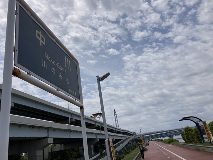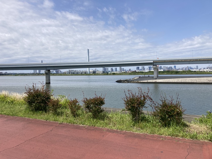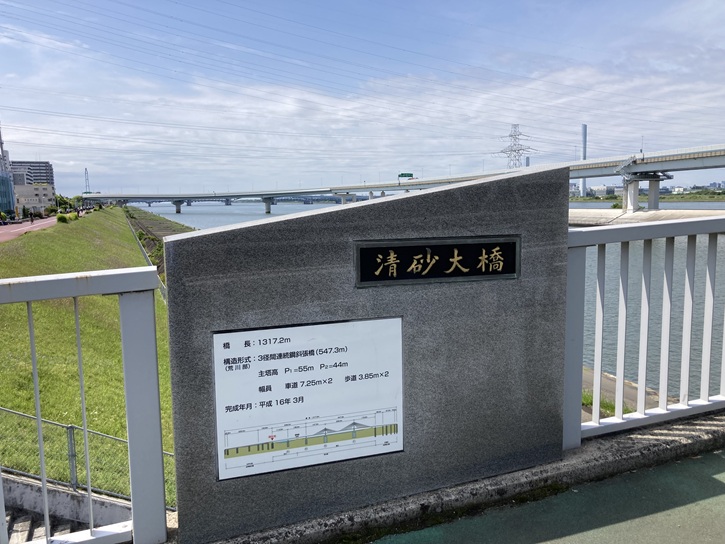 スタート地点の清砂大橋東詰から歩き始めます。清砂大橋は、荒川の河口から0.5kmの地点に架かる橋で、江戸川区清新町と江東区新砂の間の荒川(荒川放水路)および中川を跨ぎ、平成十六年(2004年)3月に完成しました。橋名は「清」新町と新「砂」の町名から一文字ずつをとって命名されました。清砂大橋は3径間連続鋼斜張橋(主塔間230m)の構造形式で、橋長は1317.2mあり、都内の一般道に架かる橋としては船堀橋に次いで2番目に長くなっています。