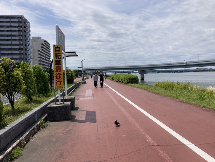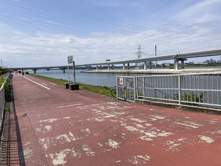 清砂大橋の歩道と荒川堤防上の遊歩道は直接繋がっていて便利です。遊歩道はサイクリング道も兼ねていて、一応歩車分離のラインは引かれていますが、それほど厳格に守られているわけではないようです。今回のコースは荒川堤防上の遊歩道と葛西臨海公園の中にある大観覧車までですが、「健康の道」としては、更に新左近川を渡って清砂大橋に戻ってくる一周6.0kmのルートが設定されています。