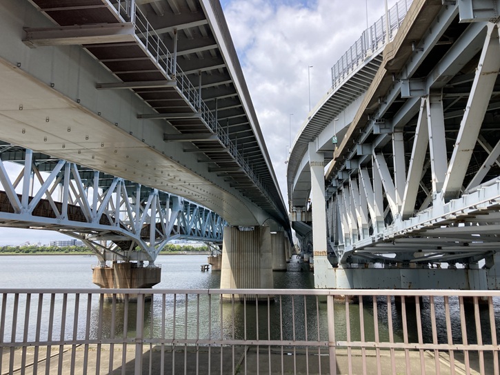 荒川河口橋は首都高速湾岸線の荒川湾岸橋を挟み、上流側に下り線(東行き)・下流側に上り線(西行き)専用の橋が架設されています。下流側に隣り合って、JR京葉線荒川橋梁が平行し、その下流で荒川と中川は東京湾に注いでいます。