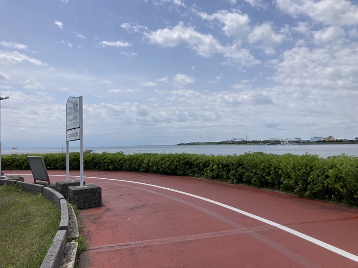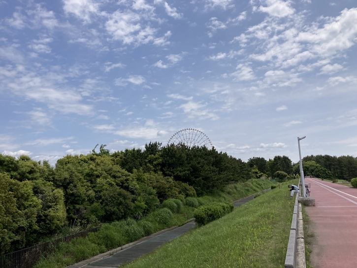 遊歩道の突端から葛西臨海公園の中に入っていきます。ゴール地点の大観覧車が見えます。