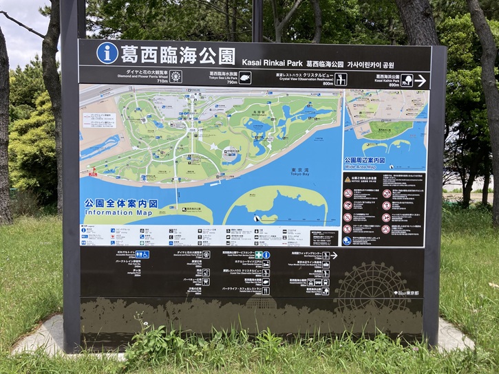 葛西臨海公園は、昭和四十七年(1972年)から平成十六年(2004年)まで実施された葛西沖開発事業により造成された公園で、葛西渚橋を介して葛西海浜公園と隣接しています。面積は約80.6haで、都内では水元公園(96ha)や小金井公園(80ha)と並ぶ大規模公園です。園内には、日本有数の水族館である葛西臨海水族園・展望レストハウス・ホテル・大観覧車・鳥類園・芝生広場があり、休日を中心に行楽地として賑わっています。