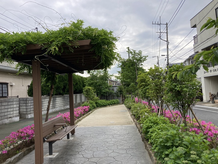 新緑が美しい遊歩道が延びています。ベンチを備えた休息所もあって、お散歩の途中でも一休みできます。