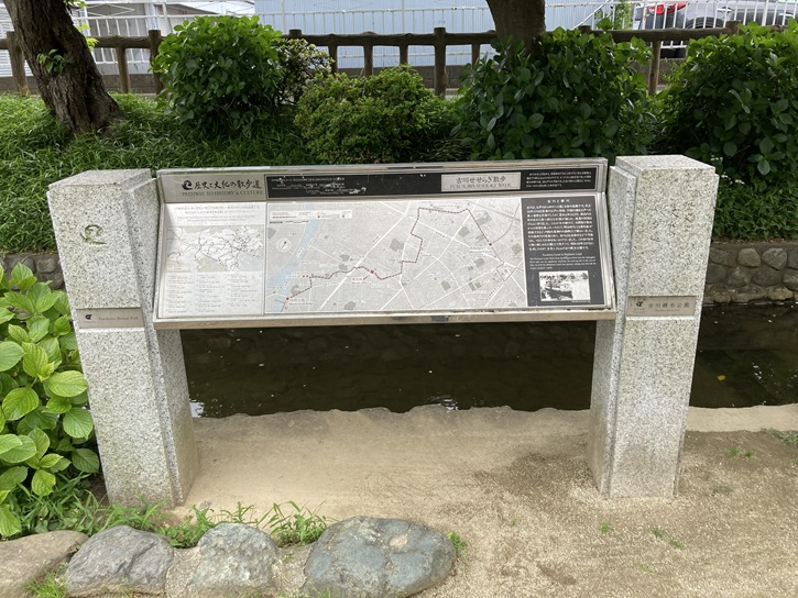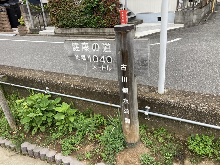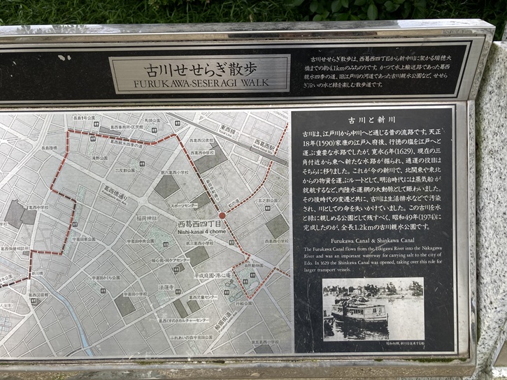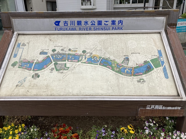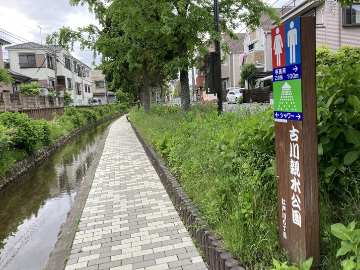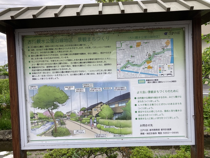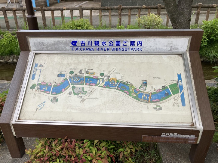 古川親水公園の案内図が立っています。古川親水公園の水路の水源は旧江戸川で、取水管を通して引き入れられています。