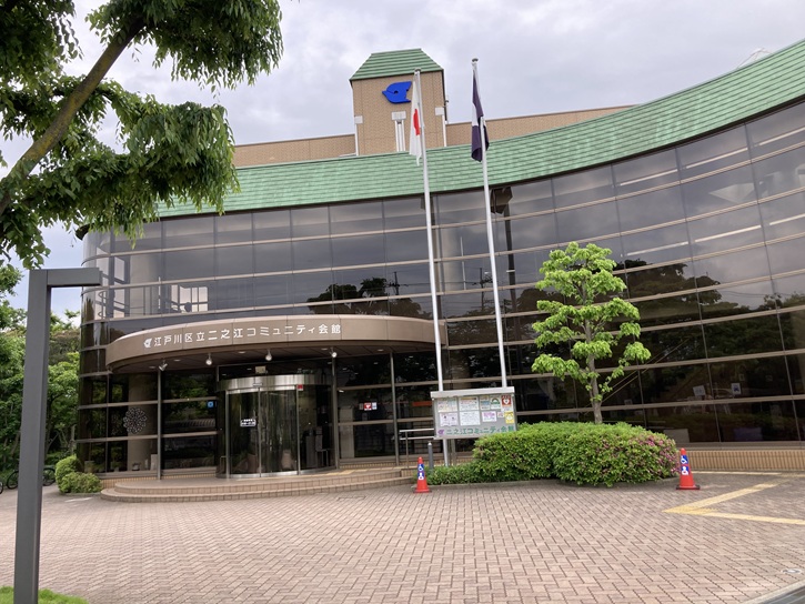 江戸川区立二之江コミュニティ会館は、古川親水公園に接しているコミュニティセンターです。周辺の景色がよく見えるように壁面がガラス張りになった建物で、館内には、バドミントン・卓球・エアロビクス・体操などができるスポーツルーム、会議や文化系サークル活動に利用できる集会室、軽運動に利用できる集会室などがあります。和室も備えられていて、茶道や華道や着付けなどに利用することができます。スポーツルームは土・日に一般開放されていて、卓球とバドミントンをすることができます。