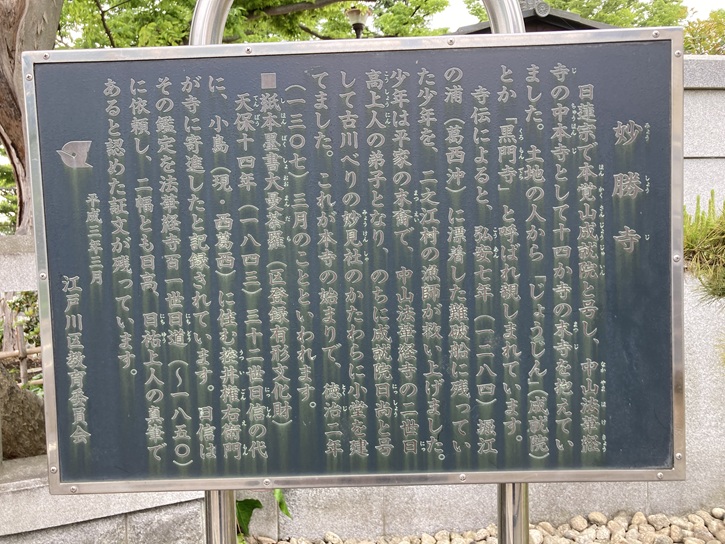 日蓮宗で本覚山成就院と号し、中山法華経寺の中本寺として十四か寺の末寺を抱えていました。土地の人から「じょうじん」(成就院)とか「黒門寺」と呼ばれ親しまれています。寺伝によると、弘安七年(1284年)堀江の浦(葛西沖)に漂着した難破船に残っていた少年を、二之江村の漁師が救い上げました。少年は平家の末裔で、中山法華経寺の二世日高上人の弟子となり、のちに成就院日尚と号して古川べりの妙見社のかたわらに小堂を建てました。これが本寺の始まりで、徳治二年(1307年)三月のことといわれます。