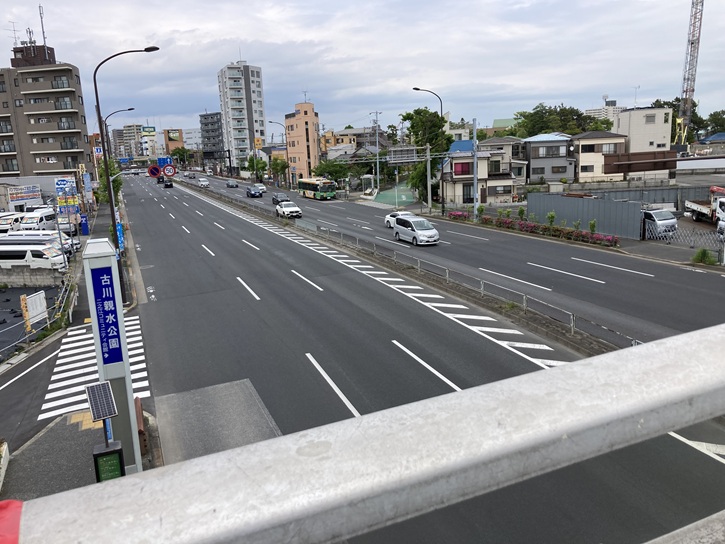 古川親水公園は、コースの中程に位置する二之江小学校の先で環七と交差しています。勿論、水路は環七の地下を通っています。