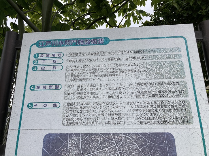 スタート地点の江戸川水閘門(篠崎水門)から歩き始めます。江戸川水閘門は、旧江戸川を仕切る水門で、江戸川区東篠崎町と千葉県市川市河原の間に位置しています。船が通るための閘門を併設しているため「水閘門」の名が付いていますが、一般には単に江戸川水門、あるいは地元の地名をとって篠崎水門などと通称されます。すぐ上流には、江戸川本川である江戸川放水路との分岐点があります。江戸川水閘門は、昭和十一年(1936年)に着工し、昭和十八年(1943年)3月に竣工しました。