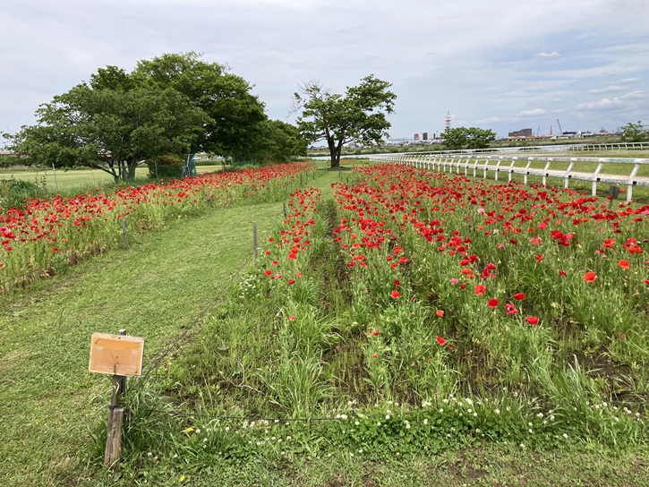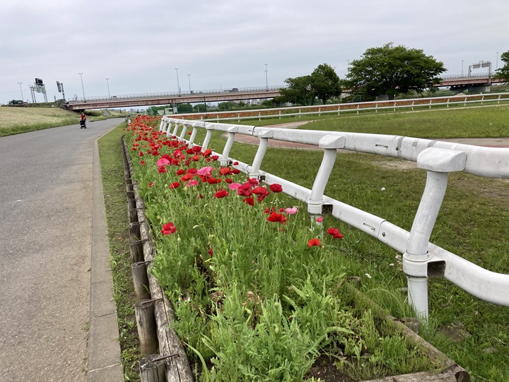 江戸川の河川敷は広大で、運動場だけでなく花壇も整備されています。花が咲いた後は、希望者が花を取り放題になるそうです。