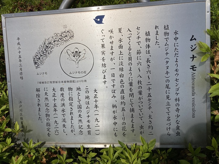 水中にただようモウセンゴケ科の奇少な食虫植物でムジナ(タヌキ)の尾に見立てて名づけられました。植物体は、長さ6〜25センチ、太さ約2センチで、節に6〜8枚の葉がついていて、虫が入ってくると貝のように葉を閉じて捕まえます。夏、水面上に淡緑白色の直径約5ミリの花を咲かせますが、一日ですぼみ、柄が水中にもぐって果実を結びます。大正十年(1921年)この地はムジナモ生育地として国の天然記念物に指定されましたが、数度の洪水で流失し、大正十五年(1926年)に天然記念物の指定を解除されました。