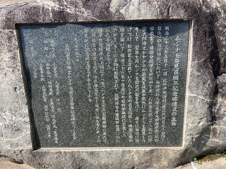 明治二十三年五月十一日、武州伊豫田村(現江戸川区北小岩四丁目先)の当河川敷において、当時理科大学(東京大学理学部)植物学教室で植物分類学を研究中であった新進気鋭二十八歳の牧野富太郎博士がヤナギの果実を採集中偶然にムジナモを発見した。そして翌年七月ムジナモ開花の報を受けて直ちに当地に駆けつけ、幻の花とされていたムジナモの花を採取し、精密な解剖図を描いて明治二十六年十月発行の植物学雑誌に公表した。やがて 多くの書物に転用されて牧野博士の業績が世界に知れわたる端緒となった。日本の植物学史上特記すべき「ムジナモ発見」百周年目にあたり、牧野博士の偉業を称え、その事実を永く後世に伝えるため、この発見地に記念碑を建立するものである。