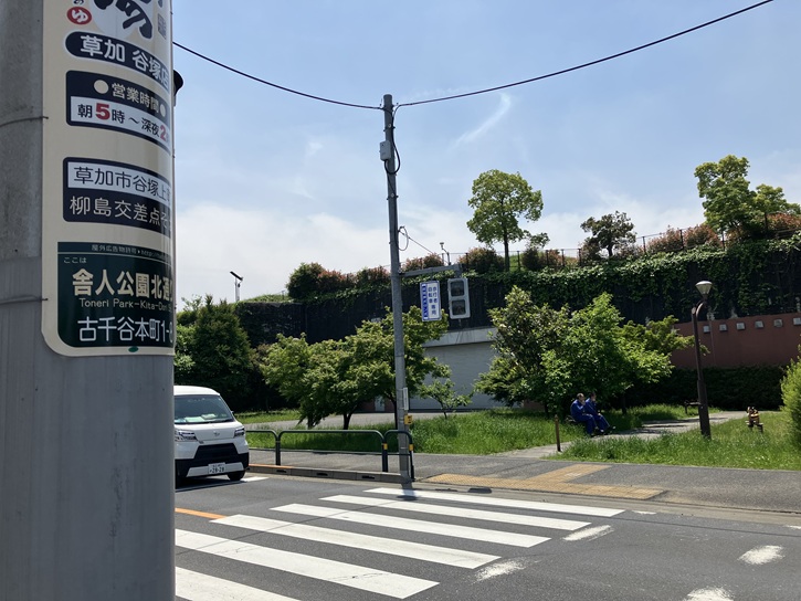 古千谷橋交差点に着きました。古千谷は「こぢや」と読みます。古千谷という地名は、舎人地域の東(コチ)に位置していたことに由来します。