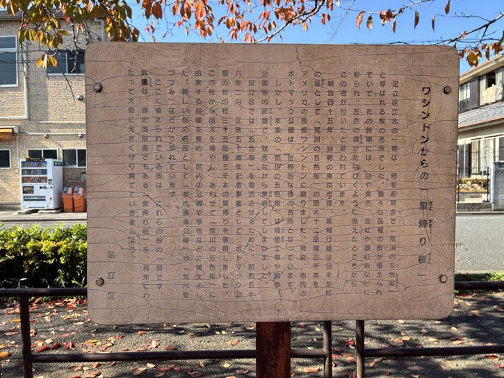 足立区江北の一帯は、昭和初期まで「荒川の五色桜」と呼ばれる桜の名所でした。様々な品種の桜が植えられていて、花の時期には、白や黄色、淡紅や濃紅色などに彩られ、五色の霞がたなびくように見えたところから。この名が付いたと言われています。明治四十五年、当時の東京市長、尾崎行雄は日米友好の証として「荒川の五色桜」の苗木十二品種三千本を、アメリカの首都ワシントンに贈りました。現在、市内のポトマック公園は、世界的な桜の名所となっています。しかし、本家の「荒川の五色桜」は堤防工事や戦争、公害等の影響で、残念ながら衰退してしまいました。足立区では「五色桜」を復活させるために、昭和五十六年二月、区政五十周年記念事業として、ポトマック公園の桜の枝三十五品種三千本の里帰りを実現しました。この枝から苗木を増やし、あわせて「荒川の五色桜」に由来する品種を集め、区内の公園や学校などに植えました。新しい桜の名所として「都市農業公園」や「荒川桜づつみ」などがうまれています。ここに植えられている桜は、これらの桜の一部です。貴重な、歴史的財産でもある「里帰り桜」を、招来にわたって大切に大きく守り育てていきましょう。