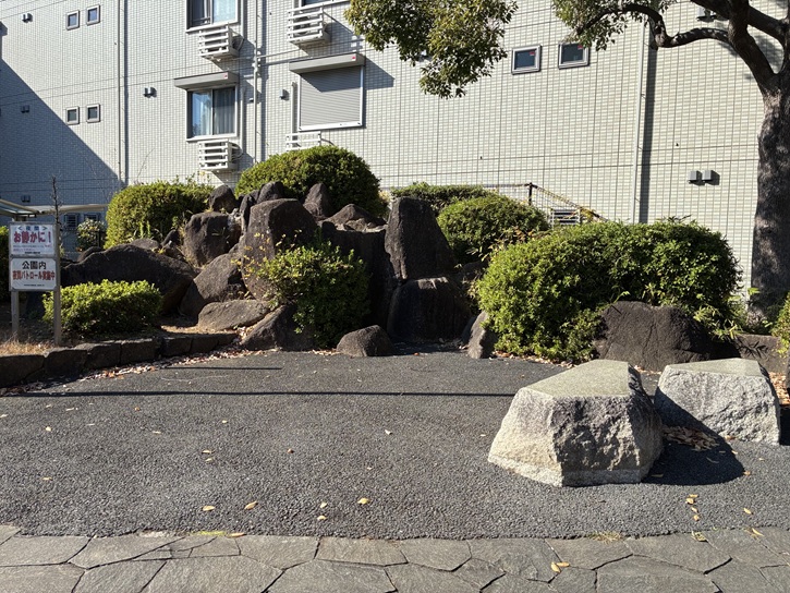 出入口には、一里塚のように松が植えられた盛土山と石灯籠風の園名標柱が立てられ、和風の風情を醸し出しています。