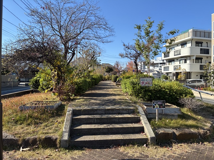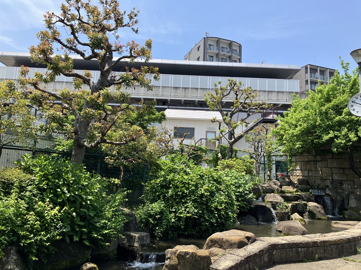 緑道自体は真っ直ぐですが、蛇行した水路が設けられ、見た目に変化を感じさせるように工夫されています。