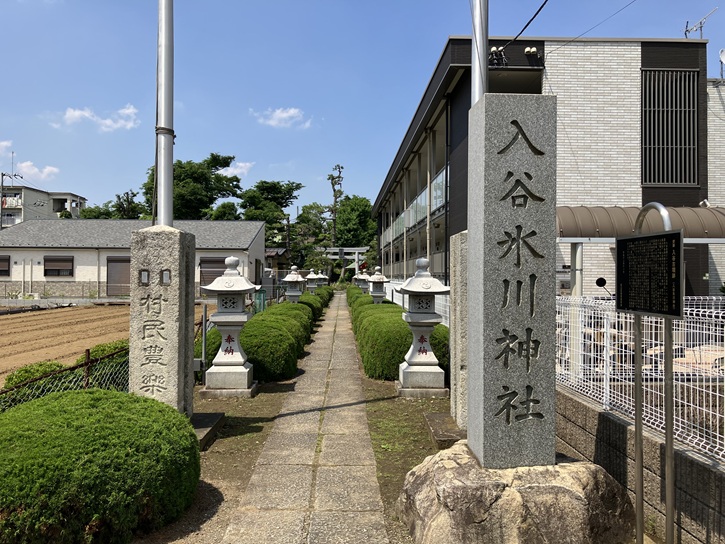 入谷氷川神社は入谷村の鎮守で、「入谷古墳」という古墳の上に建てられています。境内には、足立区が建てた「入谷古墳跡」の碑があります。