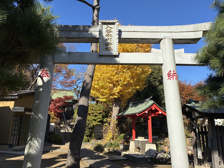 ダスキン入谷支店角の交差点を右折した先に入谷氷川神社があります。道路の脇から長く延びた参道の先に立派な石造りの鳥居が建っています。入谷氷川神社の創建年代は不明ですが、豊臣秀吉の関東攻めの際に白幡を立てたことから白幡八幡と呼ばれるようになったといわれ、戦国時代後期には八幡社であったことが分かります。江戸幕府昌平坂学問所が編纂した「新編武蔵風土記稿」にも、「八幡社」という神社が既にあったとされています。明治七年(1874年)に舎人の氷川神社から須佐之男命を分祀し、「氷川神社」に改称しました。