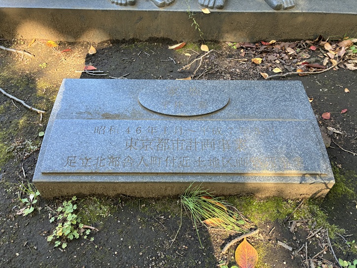 以前は神領堀から仲郷堀に分岐する入谷町四三五番地先の新井橋にありました。昭和五十七年十月、東京都の区画整理事業により当地に移設されました。平成十八年、足立区登録有形文化財(民俗資料)になりました。