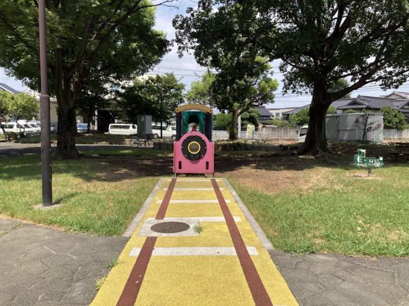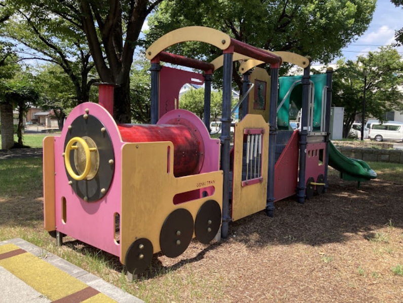 「汽車公園」のシンボルは、小さな滑り台が付属した汽車の複合遊具です。鉄琴風に音が鳴らせる遊びパネルなども付いていて、幼児が楽しく遊べます。