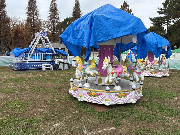 2025年は、開催初日の11月29日(土)と30日(日)に物産展「キラキラ☆マーケット」が開催され、その他にも週末などには特別企画が予定されています。地元商店街や町会・自治会・友好自治体(新潟県魚沼市・長野県山ノ内町・栃木県鹿沼市)による物販のほか、足立区を中心に活動するクリエイターや地域ブランドによる「クリスマスマーケット」も楽しめます。広場には物販店のテントが並び、メリーゴーラウンド(回転木馬)やバイキング船などの遊具もスタンバイしています。今年は新企画として、「わくわく◇HANABI(花火型電飾)」が実施され、ボタンを押すと色とりどりの花火が打ちあがるようになっているとのことです。週末などには、「ほっとカフェテリア」と称したケータリングカーによる飲食の提供も行なわれます。