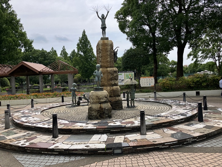 元淵江公園は、昭和四十四年(1969年)6月10日に開園しました。入口の奥には、手に避雷針(?)を持った女の子が立っています。