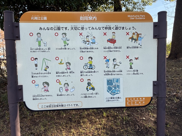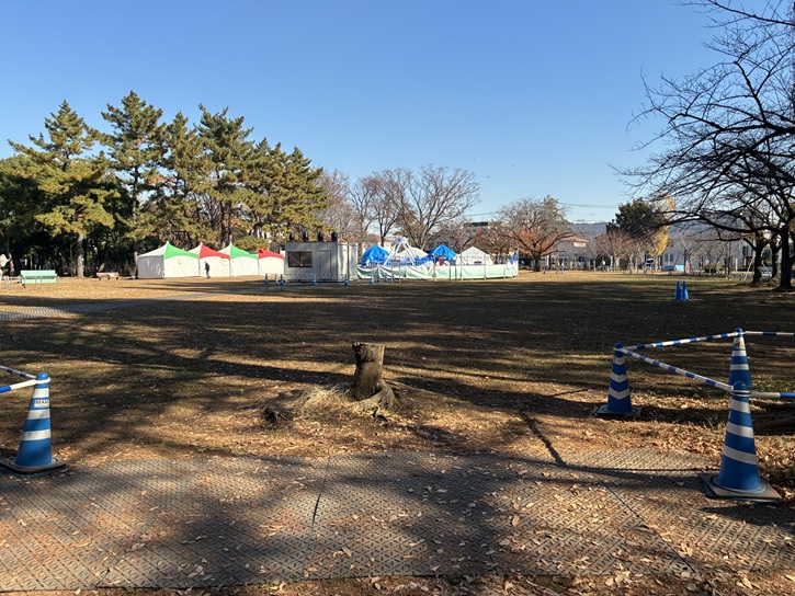 元淵江公園は、毎年11月下旬からクリスマスの時期にかけて竹ノ塚駅東口から元渕江公園までの竹の塚けやき大通りの街路樹がイルミネーションで飾られる「光の祭典」のメイン会場として知られています。12月下旬には、ステージや物産展などのイベントが開催されるなど、多くの人で賑わいます。2025年に再訪した時は、冬の風物詩にもなっている光の祭典の開催直前で、大きな看板が掛かっていました。