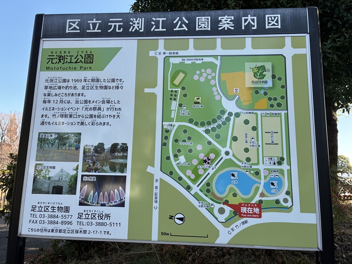 元渕江公園は1969年に開園した公園です。草地広場や釣り池、足立区生物園など様々な楽しみどころがあります。毎年12月には、当公園をメイン会場としたイルミネーションイベント「光の祭典」が行われます。竹ノ塚駅東口から公園を結ぶけやき大通りもイルミネーションで美しく彩られます。