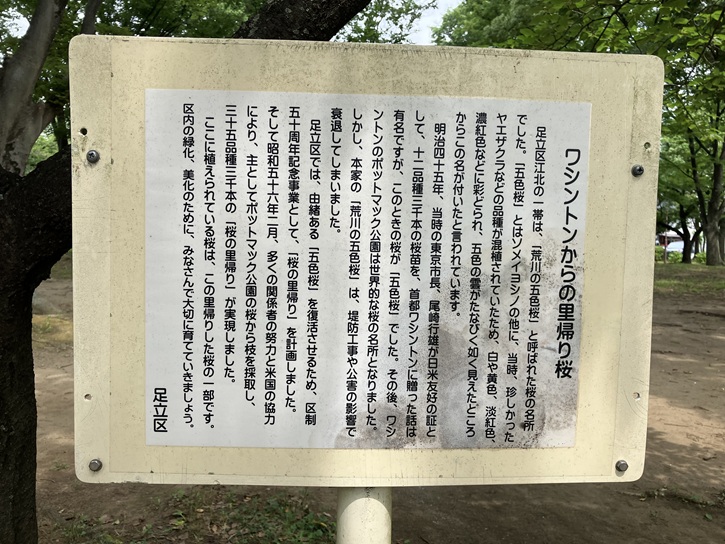 足立区江北の一帯は、昭和初期まで「荒川の五色桜」と呼ばれる桜の名所でした。様々な品種の桜が植えられていて、花の時期には、白や黄色、淡紅や濃紅色などに彩られ、五色の霞がたなびくように見えたところから。この名が付いたと言われています。明治四十五年、当時の東京市長、尾崎行雄は日米友好の証として「荒川の五色桜」の苗木十二品種三千本を、アメリカの首都ワシントンに贈りました。現在、市内のポトマック公園は、世界的な桜の名所となっています。しかし、本家の「荒川の五色桜」は堤防工事や戦争、公害等の影響で、残念ながら衰退してしまいました。足立区では「五色桜」を復活させるために、昭和五十六年二月、区政五十周年記念事業として、ポトマック公園の桜の枝三十五品種三千本の里帰りを実現しました。この枝から苗木を増やし、あわせて「荒川の五色桜」に由来する品種を集め、区内の公園や学校などに植えました。新しい桜の名所として「都市農業公園」や「荒川桜づつみ」などがうまれています。ここに植えられている桜は、これらの桜の一部です。貴重な、歴史的財産でもある「里帰り桜」を、招来にわたって大切に大きく守り育てていきましょう。