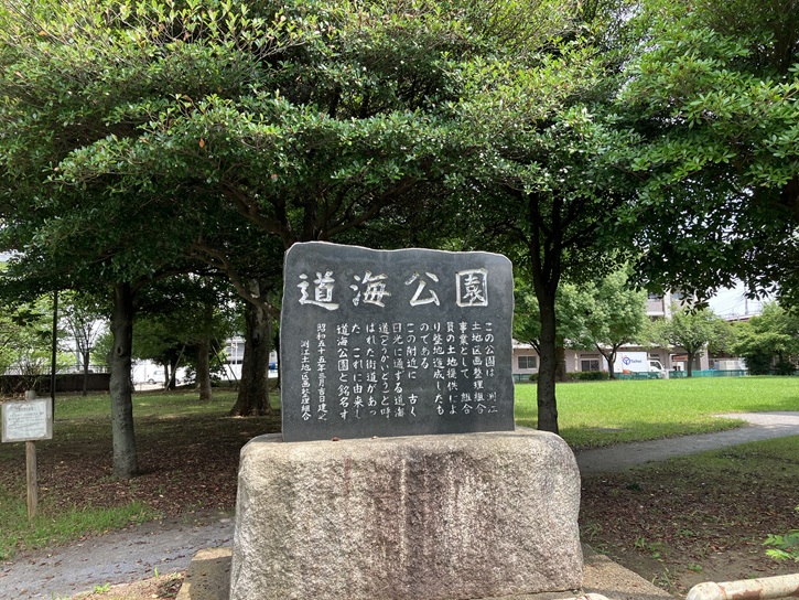 この公園は、渕江土地区画整理組合事業として、組合員の土地提供により整地造成したものである。この附近に、古く日光に通ずる道海道(どうかいどう)と呼ばれた街道があった。これに由来し、道海公園と銘名す。