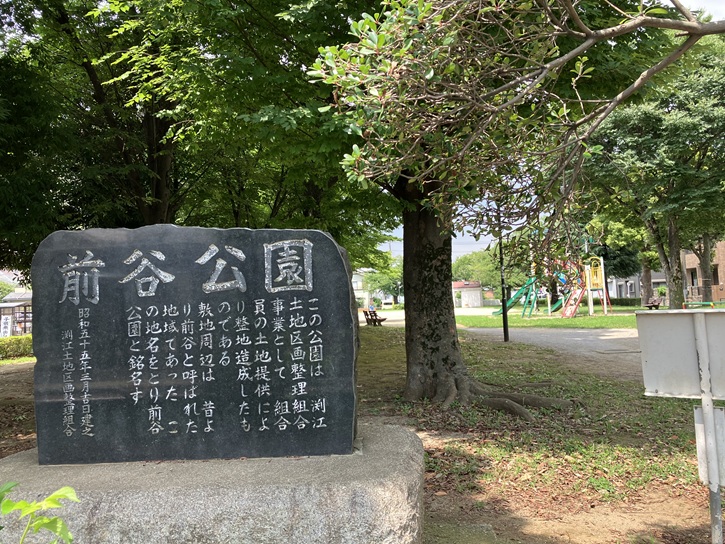 この公園は、渕江土地区画整理組合事業として、組合員の土地提供により整地造成したものである。敷地周辺は、昔より前谷と呼ばれた地域であった。この地名をとり前谷公園と銘名す。