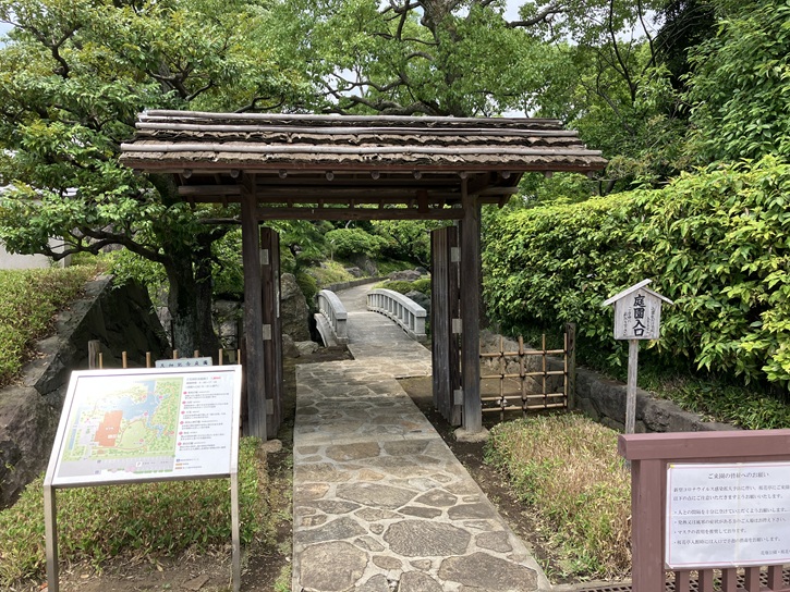昔、このあたりは緑と水豊かな農村風景がひらけ、武蔵国足立郡花又村と呼ばれていました。その後、東京府南足立郡となり、昭和七年、東京市に編入され、足立区が誕生しました。昭和五十七年、足立区は区制五十周年を記念し、花畑町土地区画整理組合の協力を得て、この庭園の建設に着手しました。区民の皆さんの憩の場として緑と水豊かなこの庭園を大切にし、後世に伝えていきましょう。