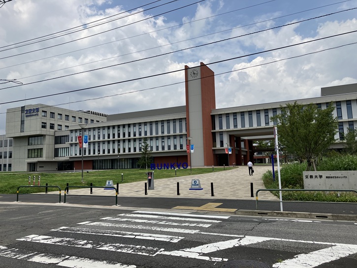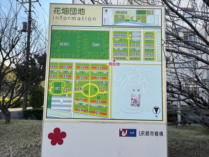 花畑団地を東西に貫く通リに出ます。かって、団地のA及びB街区だった区画(4.7ヘクタール)は更地になり、その跡地に文教大学が開校しました。文教大学は、学校教員の養成に力を入れている大学で、公立学校の教員採用人数は全国一位となっています。令和三年(2021年)4月に開設された東京あだちキャンパスには国際学部と経営学部があり、約1、800人の学生が学んでいます。