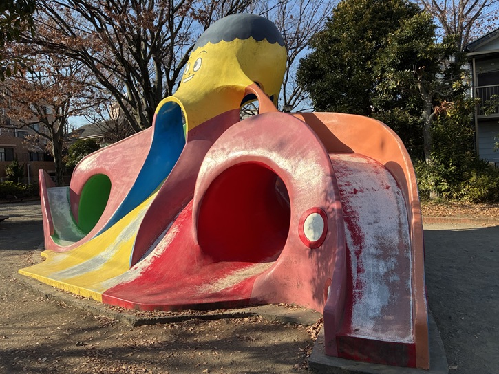 公園にはピンク色の巨大なタコの遊具があり、子ども達に大人気です。タコの口から四方八方に伸びた足のレーンを滑り降りるすべり台となっています。子ども達は何度も繰返してタコの口の中に入り、歓声をあげながら思い思いの方向にすべって遊ぶことができます。