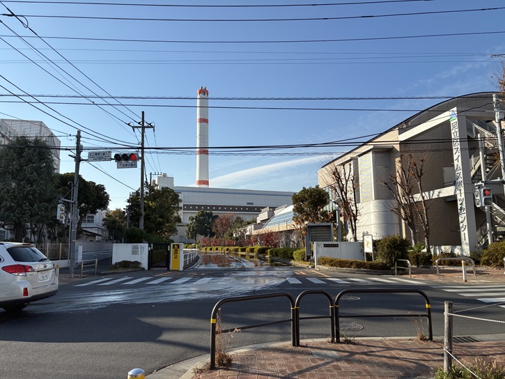 旧日光街道に面して足立清掃工場があります。足立清掃工場は、東京二十三区清掃一部事務組合の清掃工場で、人口約70万人を擁する足立区内のごみ処理を行っています。足立区でのごみ処理は足立塵芥焼却場(昭和十一年)が起源で、埼玉県との都県境にほど近い竹の塚地区にあります。発生した余熱はスイムスポーツセンター(うきうき館)で利用されています。昭和三十九年(1964年)に日本初の大規模連続焼却炉である初代の工場が竣工し、昭和五十二年(1977年)に250tの焼却炉が4炉ある二代目の工場が竣工し、三代目の現在の清掃工場は平成十七年(2005年)に完成しました。煙突の高さは130mで、赤と白が斑になった足立清掃工場の煙突は、令和七年(2025年)に竣工したシティタワー千住大橋に次ぐ高さを誇っています。