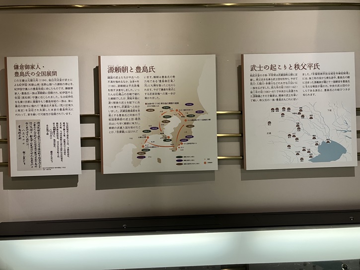 桓武天皇の子孫・平将常は武蔵国秩父郡に定着し、秩父氏を名乗る武士団を形作り、やがて荒川・入間川・多摩川などの大きな川沿いに一族を広げました。前九年の役(1051年〜1062年)・後三年の役(1083年〜1087年)で中央から派遣された源頼義とその子義家は、関東の武士を率いて戦い、秩父氏の一族豊島氏もこれに従いました。「平塚明神并別当城官寺縁起絵巻」には、後三年の役から帰る途中、豊島氏の館に泊まった源義家が鎧と十一面観音を豊島氏に与える場面が描かれ、中央の武士団のかしらである源氏と、豊島氏との結びつきが知られます。