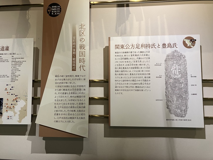 東国の行政機関の要であった鎌倉公方足利持氏は、新たに室町幕府六代将軍になった足利義教と対立し、代替わりで正長二年(1429年)を改元し「永享元年」としたことを認めず、正長元号を使い続けました。国人領主豊島氏の支配領域にあった北区堀船の福性寺には、この正長三年(1430年)銘の板碑があり、豊島氏が足利持氏の勢力下にあったことがうかがえます。南北朝時代から室町時代の戦乱の中で河越氏や江戸氏などの多くの伝統的な秩父平氏が滅びるなかで秩父平氏・豊島氏はたくみに関東の中世社会の中で命脈を保っていったのです。