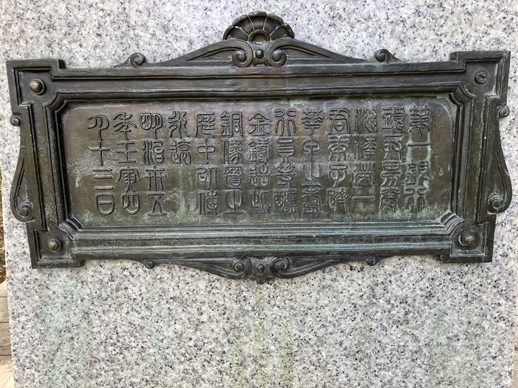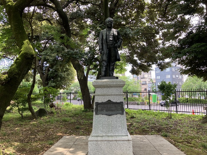 晩香廬を見渡すように、北区に残る唯一の渋沢栄一の銅像が建っています。この銅像は頭取栄一翁の還暦を祝って第一銀行行員一同が建てたものです。明治三十五年に第一銀行の中庭に設置されましたが、大正十二年の関東大震災で第一銀行本店が羅災し、世田谷清和園という保養施設に移され、その後、昭和三十一年に現在地に移されました。銅像の高さは151cmで、等身大とのことです。意外と小柄だったんですね。