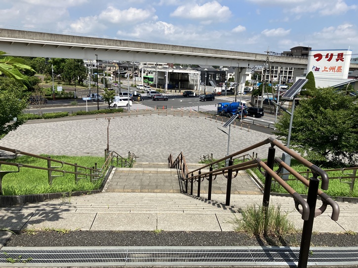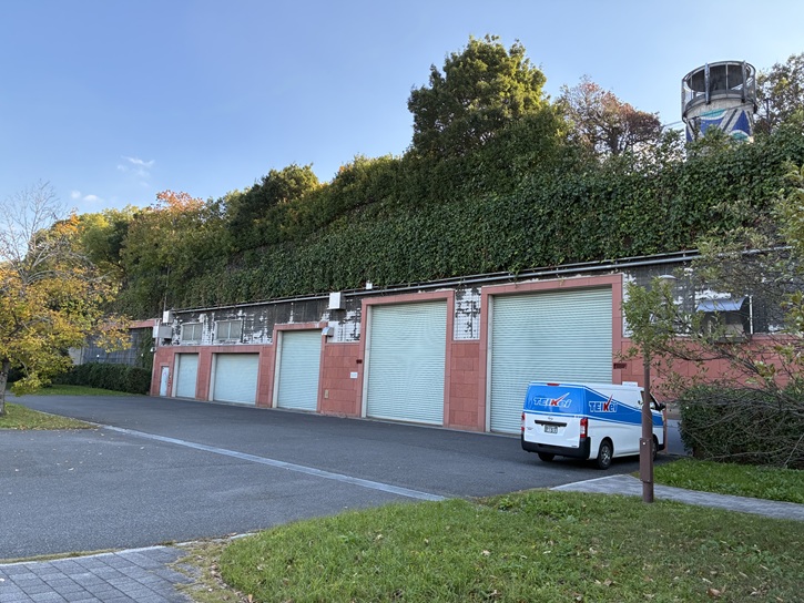 舎人公園の敷地は、元々は高低差のない平地でしたが、東京都交通局の日暮里・舎人ライナーの車両を格納する基地を建設する際に土地の掘削は殆ど行わず、舎人公園内北東部の未開園部分(面積約1.1ha)の地上面に構造物を構築後、その構造物全体を土で覆い、上部は公園として供用する半地下方式の車両基地にしました。車両基地は、鉄筋コンクリート構造で、全長533m・幅84.5m・高さ5.4m〜12.3m・床面積約40、000uの規模で、上床版の上には約2mの覆土を行い、舎人公園の一部として整備しました。そのため、公園の北東部分が盛り上がった丘のような形状になりました。車両基地の入口は階段の脇に設けられていて、車両の出し入れに使用する巨大なシャッターが並んでいます。
