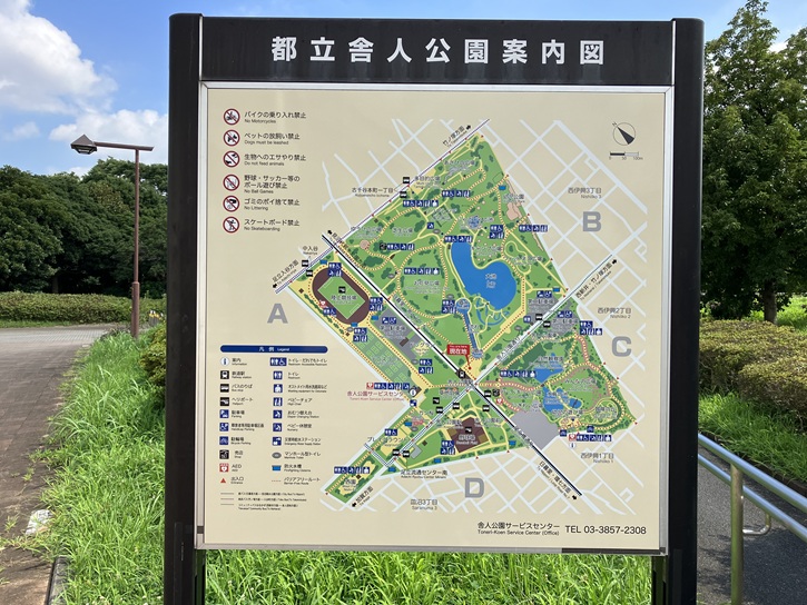 舎人公園は、公園中央で十字に交わる道路(尾久橋通り・舎人公園通り)で4区画に分けられています。西側敷地(A・D地区)に陸上競技場(3種公認)・テニスコート・野球場などのスポーツ施設、東側(B・C地区)には水鳥が見られる大池や親水広場などの自然と親しむスペースやキャンプ場が設けられています。また、南東部にはバードサンクチュアリの施設もあります。バードサンクチュアリーとは、野鳥たちだけの住処で、巣作りに適したガマやアシ、そして雑木林などの環境管理を行ない、観察舎からは様々な野鳥たちを観察できます。公園の面積は、都立公園の中で3番目の広さを誇り、東京ドーム約14個分の64.96ヘクタールあります。23区内の都立公園としては3番目の規模(1位:水元公園、2位葛西臨海公園)になっています。