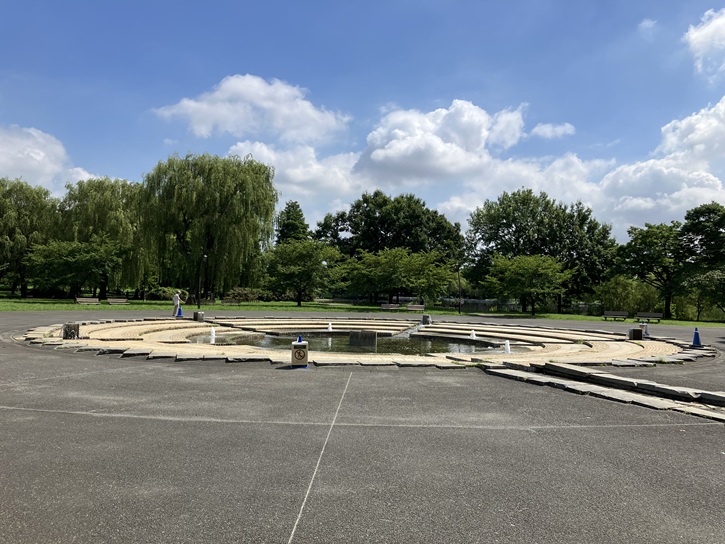 舎人公園には噴水広場が2ケ所あります。公園入口の小さな噴水広場と大池近くの大きな噴水広場で、両側に高木が立ち並ぶ水路によって結ばれています。何回か舎人公園を訪れましたが、水路に水が流れているのを見たことがありません。こちらは公園の入口にある噴水広場です。