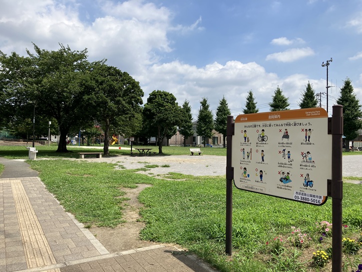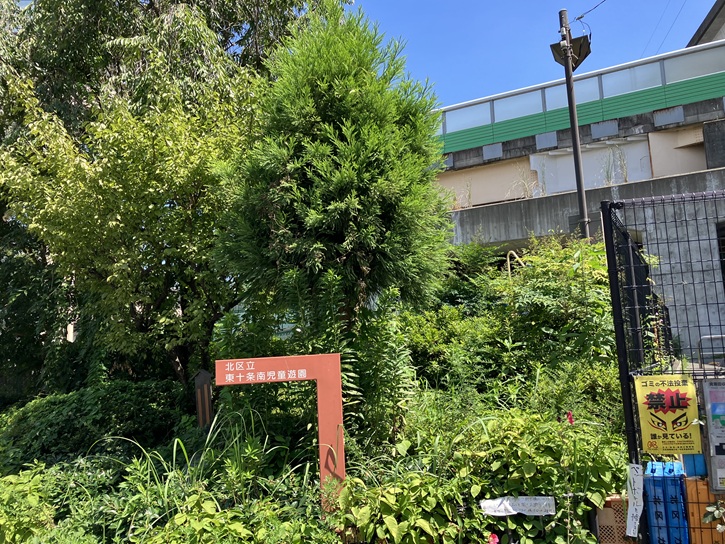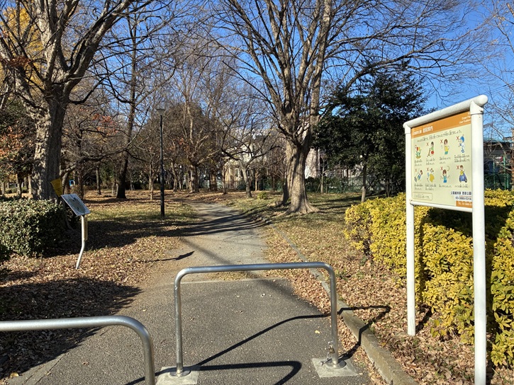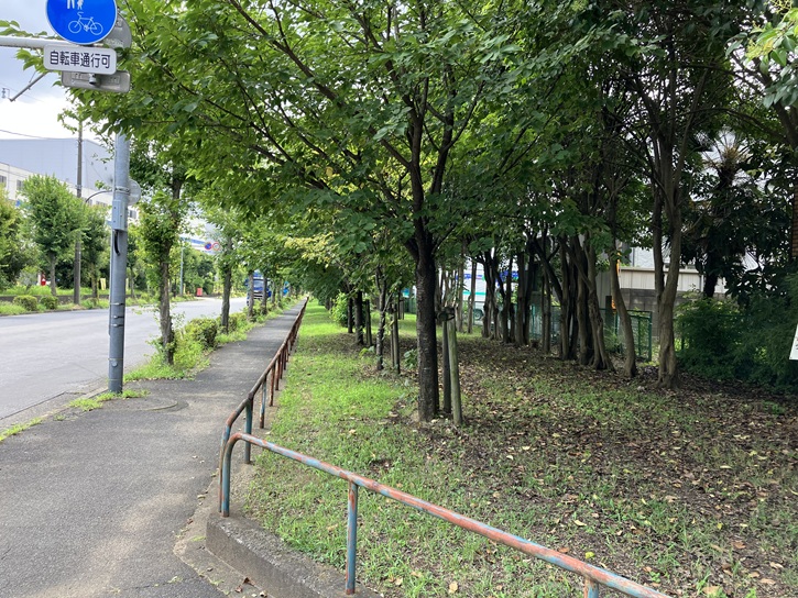 北足立市場と道路を隔てた向かい側には、東西に細長く延びた入谷緑地公園があります。入谷緑地公園は、樹木が生い茂り、緑が一杯の気持ちの良い公園です。
