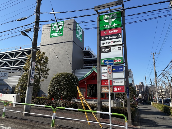 尾久橋通りと舎人公園北通りとの交差点を左折します。道路の左手には、北足立市場があります。北足立市場は、青果物と花き部を併設した東京都中央卸売市場のひとつで、足立区北東部における青果及び花き流通の拠点市場となっています。首都高速川口線「足立入谷」インターから近く、日暮里・舎人ライナー「舎人公園」駅からも徒歩10分とアクセス良好な市場です。毎年秋には「市場まつり」が開催され多くの人々で賑わいます。青果部は、千住にある足立市場の取扱量増加に伴う狭隘化を解消するため、青果部のみを移設する形で昭和五十四年9月17日に開場しました。花き部は、周辺の花き地方卸売市場5市場を統合し、昭和六十三年4月25日に東京都中央卸売市場としては初の花き部として開場しました。市場内には巨大な倉庫が並んでいます。