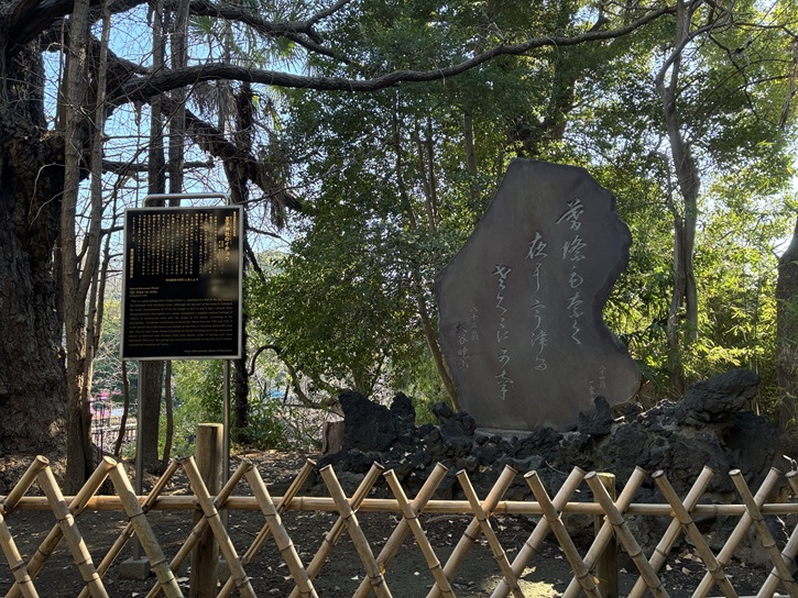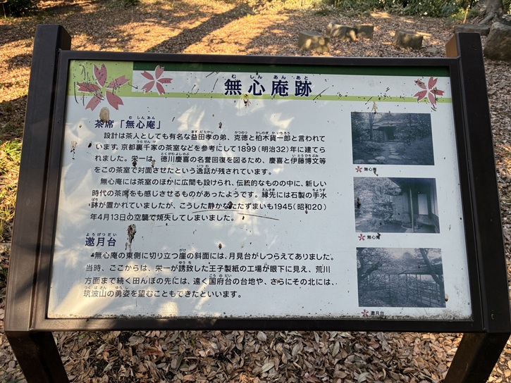 無心庵の東側に切り立つ崖の斜面には、月見台がしつらえてありました。当時、ここからは、栄一が誘致した王子製紙の工場が眼下に見え、荒川方面まで続く田んぼの先には、遠く国府台の台地や、さらにその北には、筑波山の勇姿を望むこともできたといいます。