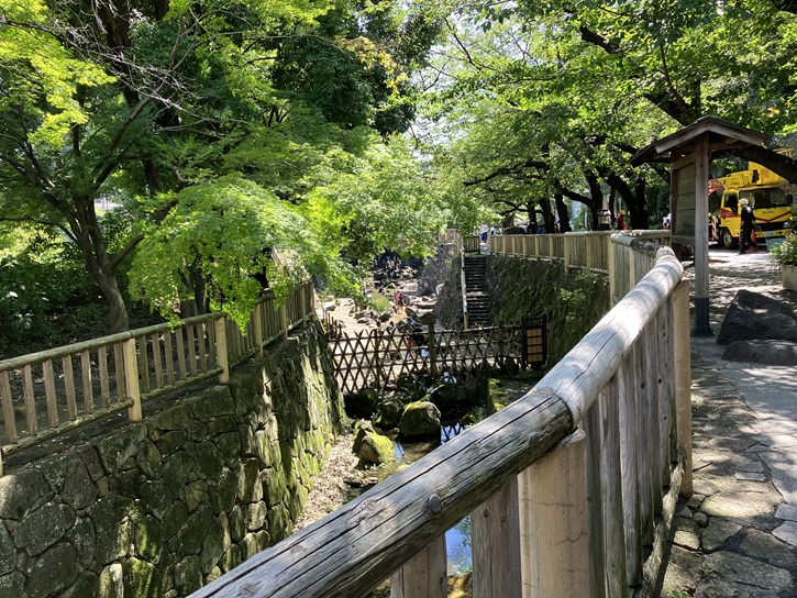 せます。浸み込まなかった残りの水は、一時的に自由広場の中に貯めて、その後ゆっくりと公園の外に出るようになっています。このような理由で、強い雨の後、公園内に水が貯まっていて、御不便をおかけすることがあります。水害防止のためですので、御理解をお願いします。