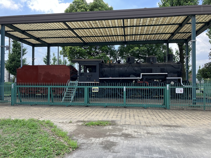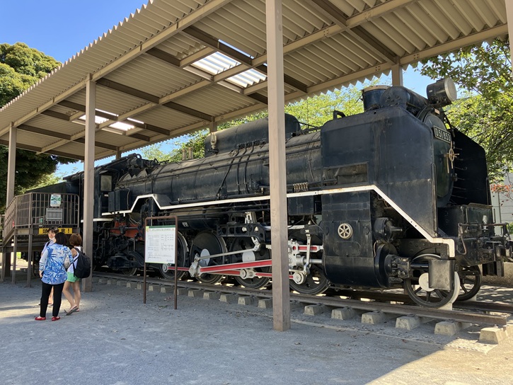 入口広場の奥には、現在修理中で中に入ることは出来ませんが、蒸気機関車が保存・展示されています。