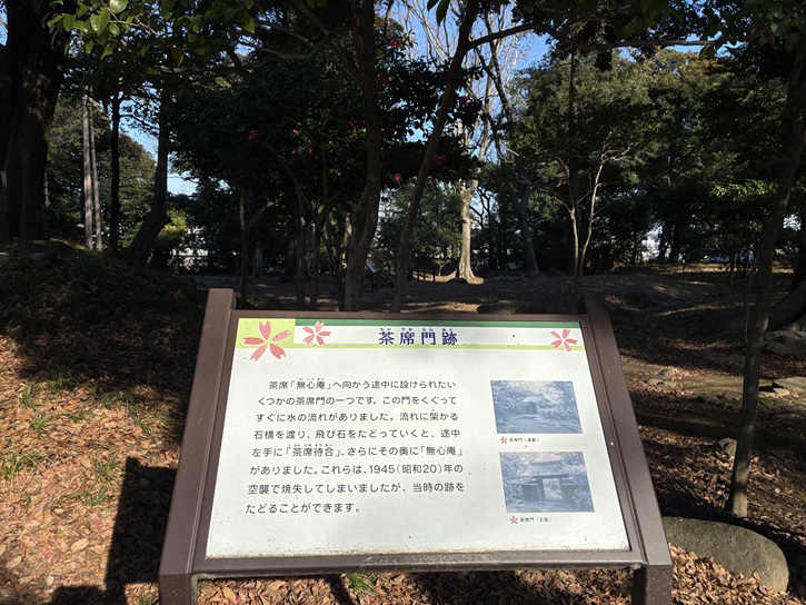 茶席「無心庵」へ向かう途中に設けられたいくつかの茶席門の一つです。この門をくぐってすぐに水の流れがありました。流れに架かる石橋を渡り、飛び石をたどっていくと、途中左手に「茶席待合」、さらにその奥に「無心庵」がありました。これらは、昭和二十年(1945年)の空襲で焼失してしまいましたが、当時の跡をたどることができます。