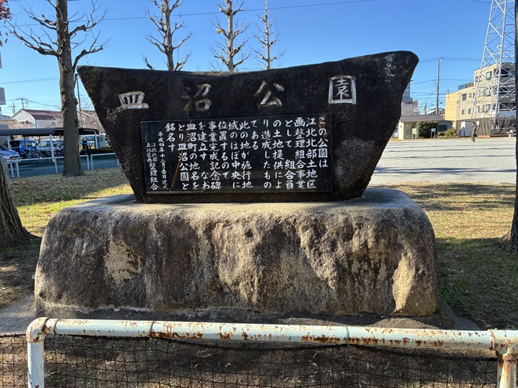 この公園は、江北北部土地区画整理組合事業として、組合員の土地提供により造成したものである。此の地が施工地域のほぼ中央に位置するので、事業完成記念碑を建立する。なお、皿沼町の地名をとり、皿沼公園と銘名す。