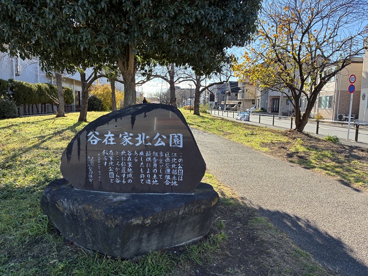 この公園は、江北北部土地区画整理組合事業として組合員の土地提供により造成したものである。谷在家地域の北に位置するところから、谷在家北公園と銘名す。