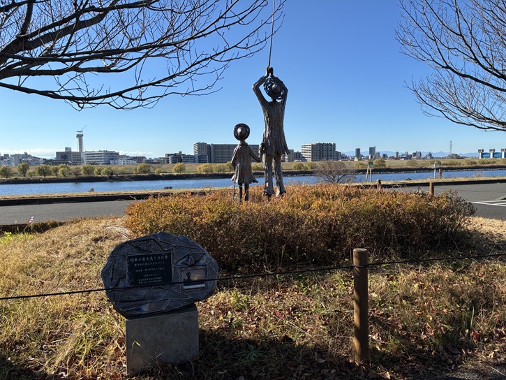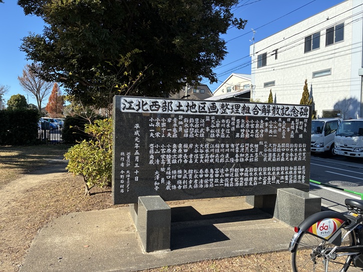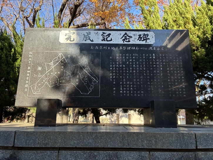記念碑の左手には関係者の氏名を記した石碑、右手には区画整理の対象となった地域の図を記した石碑が建っています。総面積は、152.06ヘクタールに及んでいます。ちなみに、1ヘクタールは10、000平方メートルに相当し、これは100mX100mの正方形の面積と同じです。身近な例では、東京ドームの約2.1個分に匹敵する広さです。つまり、東京ドームが320個収まる計算になります。