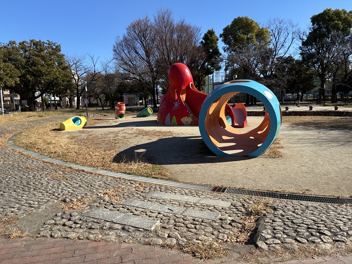 定番のタコの滑り台もあります。公園の中には、ピクニックが楽しめる桜の広場があり、さらに夏にはジャブジャブ池もオープンします。